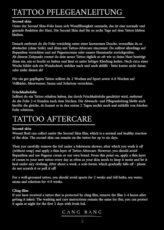 Ablauf danach: Nach deinem Erstgespräche wird ein Tattoo-Termin ausgemacht für das eigentliche Tattowieren. Bitte beachte, dass hier bei nicht Antritt deines Termins ohne Absage eine Ausfallgebühr berechnet wird!